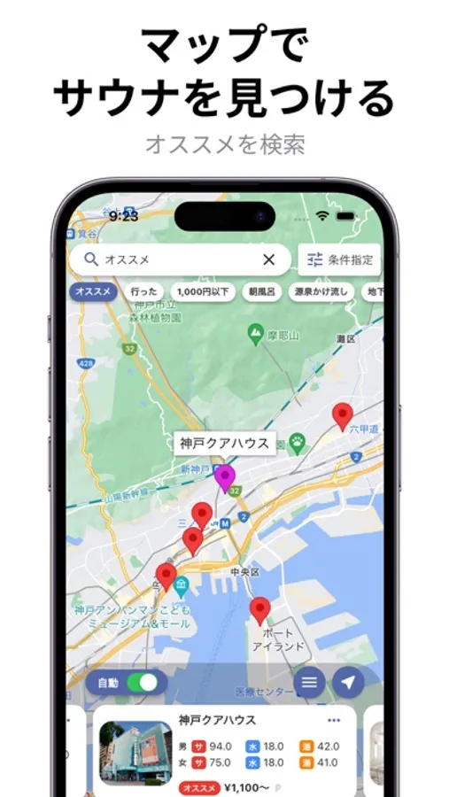 スマホの位置情報により、マップを使って周辺のサウナ施設をすぐに検索できます。さらにマップを気になる地域に合わせるとその周辺のサウナ施設も検索できます。