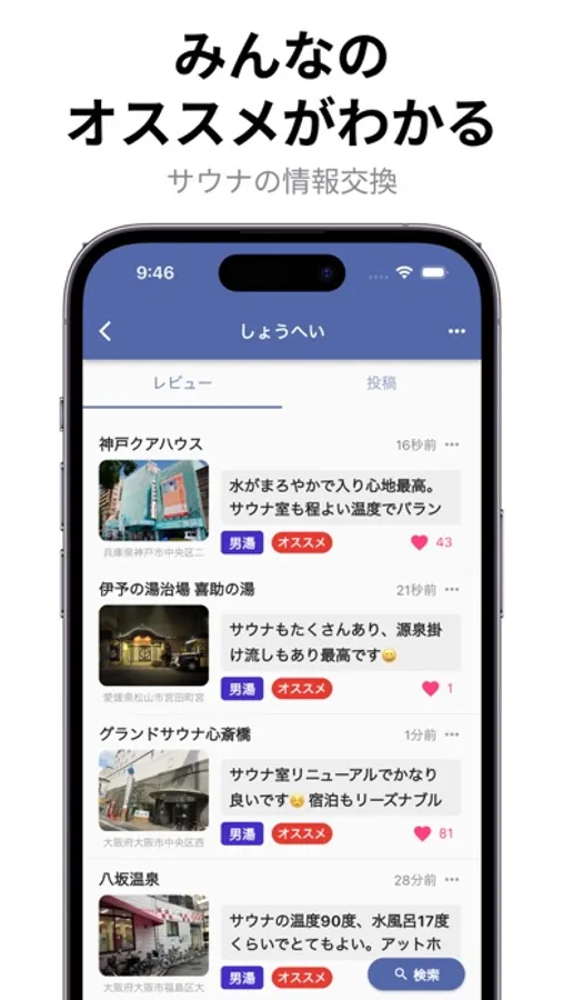 投稿に対して「いいね」「コメント」することができ、そのコメントに対して返信もできます。コメントをするとサウナー同士のつながりが増え、交流が深まります。ぜひアプリで新しいサフレ(サウナー友達・サウナフレンド)を見つけましょう!