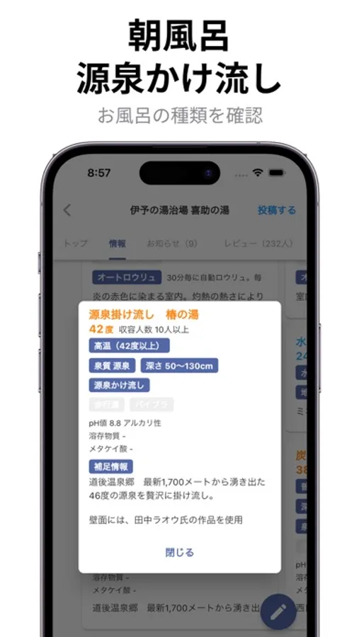サウナライフは「あつ湯」と「水風呂」を合わせた温冷交代浴も推奨しておりその一環として「お風呂の温度」「源泉かけ流し」がある施設を検索できます。サウナと源泉かけ流しの両方を楽しめる施設をアプリで確認できます。