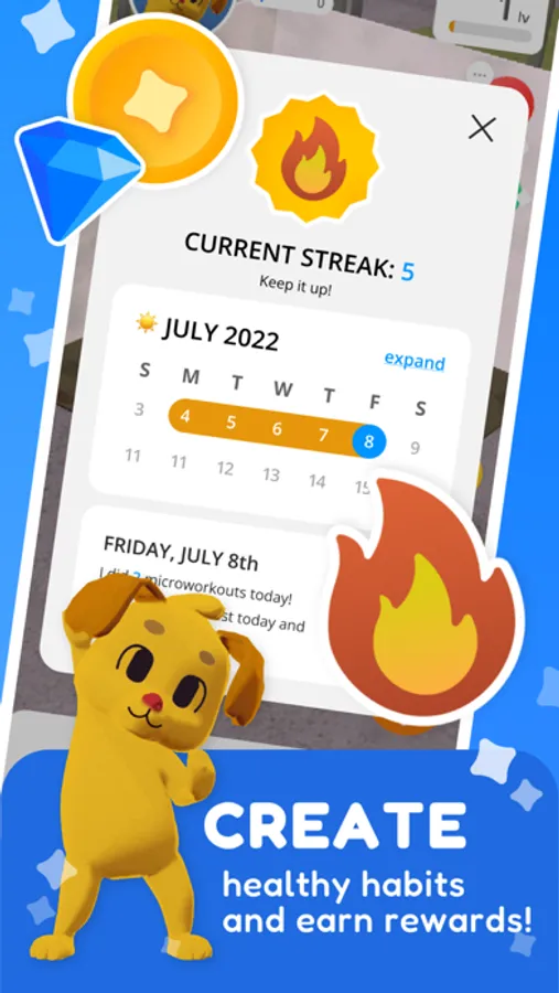 Finding motivation to regularly exercise on your own is hard. That’s where Fitment! can help! Even with only a few spare minutes, you can fit cozy, approachable, and effective exercise into your day. Work out alongside cute Fitbuddies like Monroe the dog to earn coins and collect rewards to decorate your virtual house. Level up and gain new exercise moves, fun furniture, cool outfits, and even adorable pets for your new workout buddy. With Fitment, it’s easy to stay motivated and on track on your personal health journey!