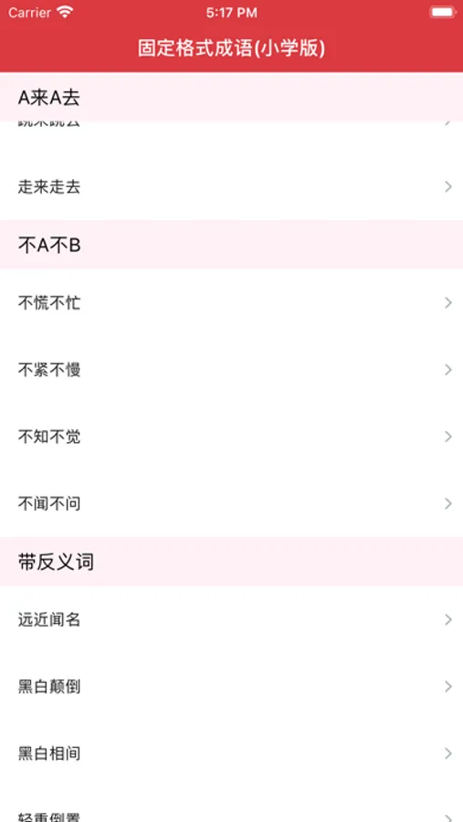“固定格式成语”主要展示的是小学常考成语,包括的格式为:ABB、AABC、AABB、ABAC、又A又B、A来A去、不A不B;同时,可以查看成语的基本解释,近义词,反义词。