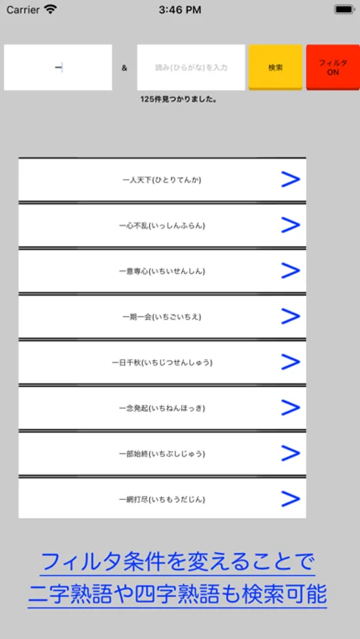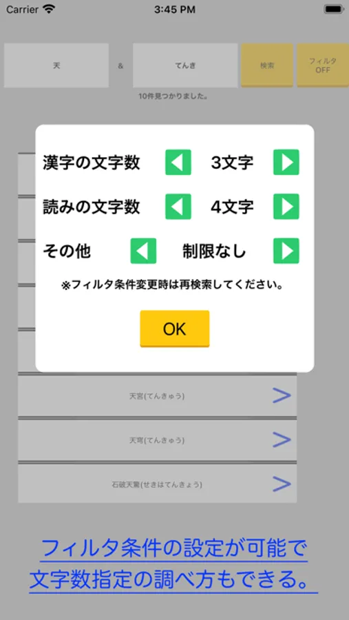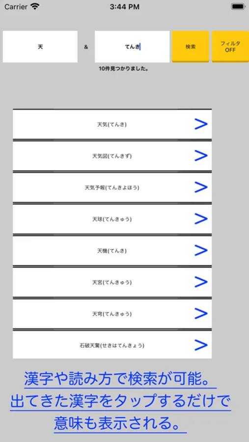 漢字の一部だけや読み方の一部だけで検索することもでき、漢字と読み方の両方を組み合わせた検索も可能です。また、フィルタ機能も備えており、漢字の文字数や読みの文字数などを指定することも出来ます。