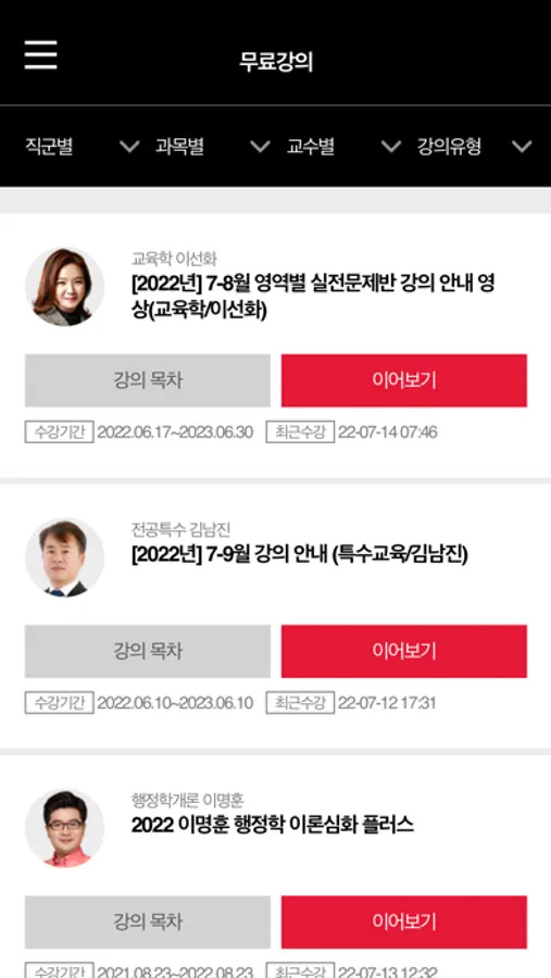- 공무원, 경찰, 부동산, 임용, 자격증 등 약 120개의 무료강의를 제공합니다.