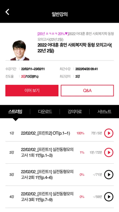 - ‘이어보기’ 마지막 수강했던 강의의 마지막 수강 시점부터 재생됩니다.