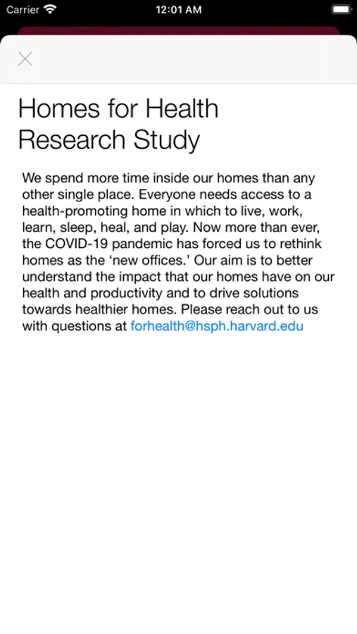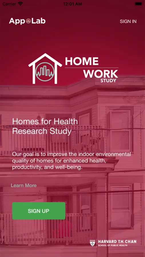 The Home/Work Study app was designed using AppLab as the data collection tool for the Harvard Home/Work Study, a research project looking at the impacts of our homes on health and productivity. The app administers a series of health and wellbeing surveys to allow remote participation and engagement. In addition to administering surveys, the app provides a dashboard to track participants' progress. If you would like to learn more about the study or are interested in participating, please contact forhealth@hsph.harvard.edu