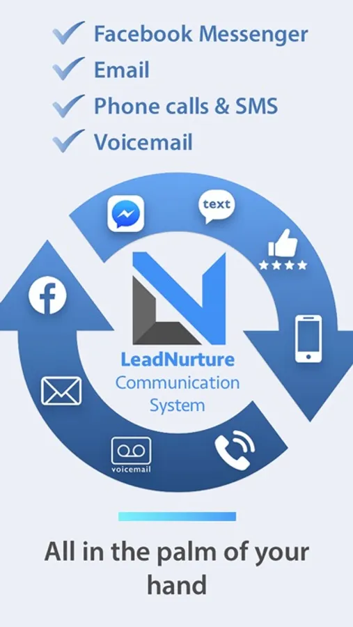 Enjoy universal communication with your new leads, customers, and clients in the palm of your hand: Facebook messenger, phone calls, SMS/texting, voicemail, email and more.
