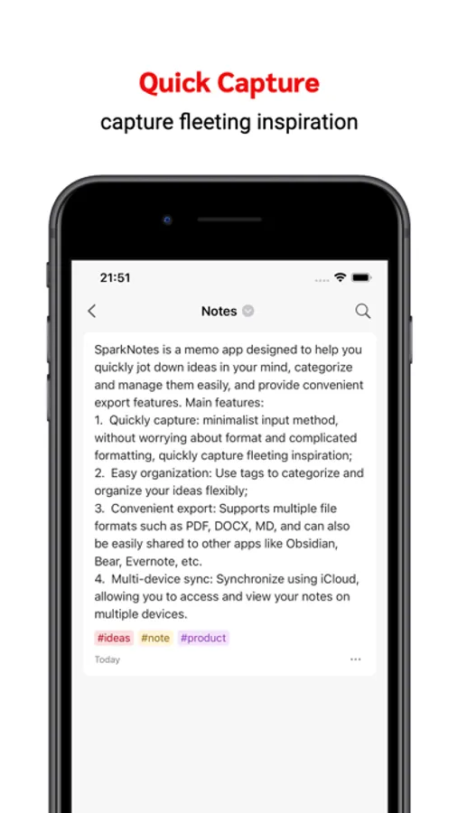 SparkNotes is a memo app designed to help you quickly jot down ideas in your mind, categorize and manage them easily, and provide convenient export features.