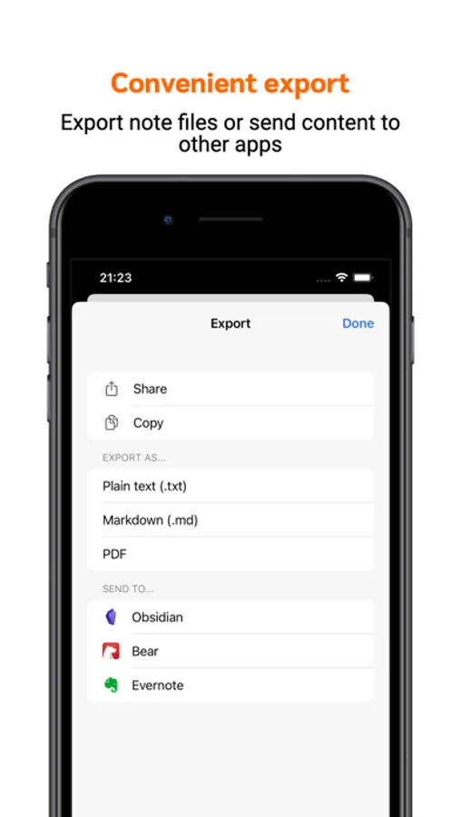 3. Convenient export: Supports multiple file formats such as PDF, DOCX, MD, and can also be easily shared to other apps like Obsidian, Bear, Evernote, etc.