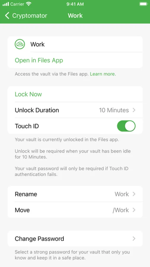 • Create vaults in any location via other File Providers (third-party apps must support this)