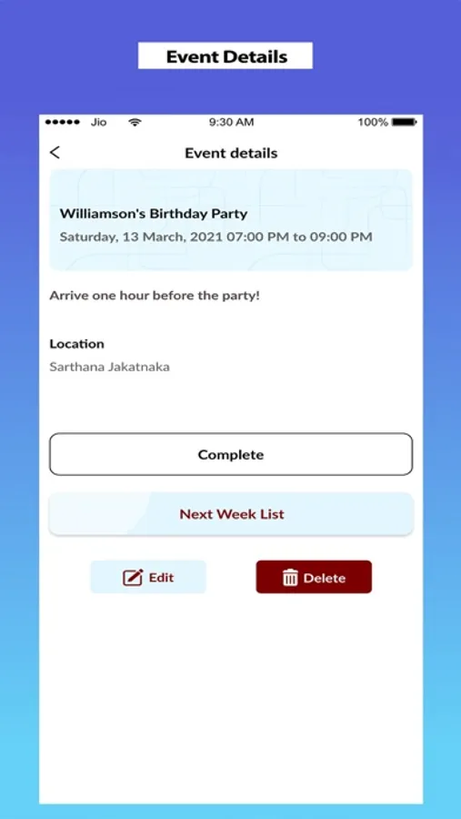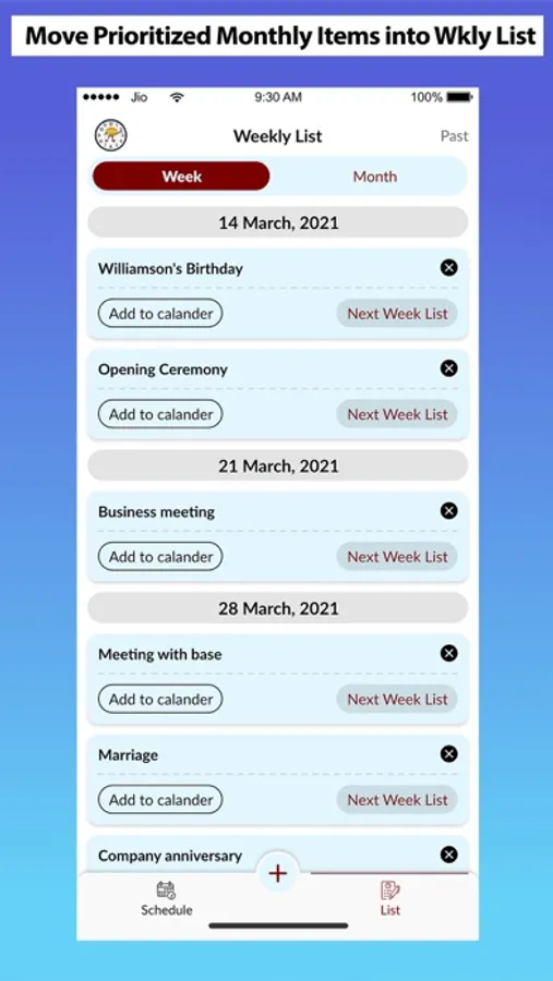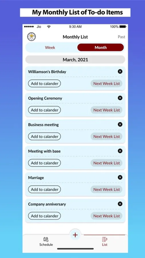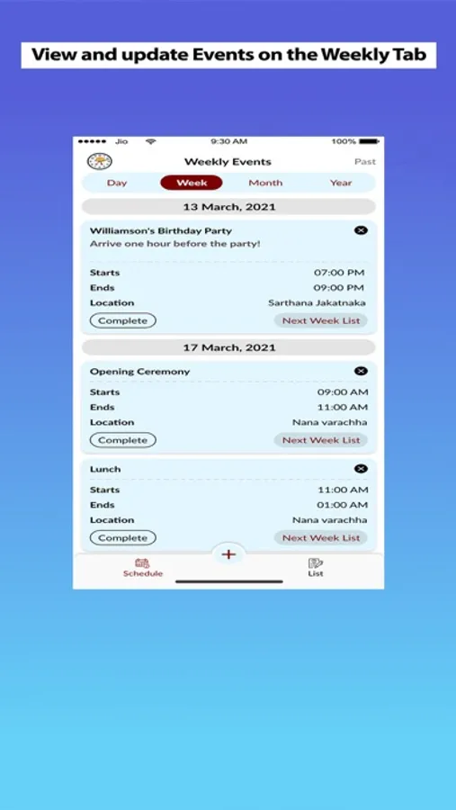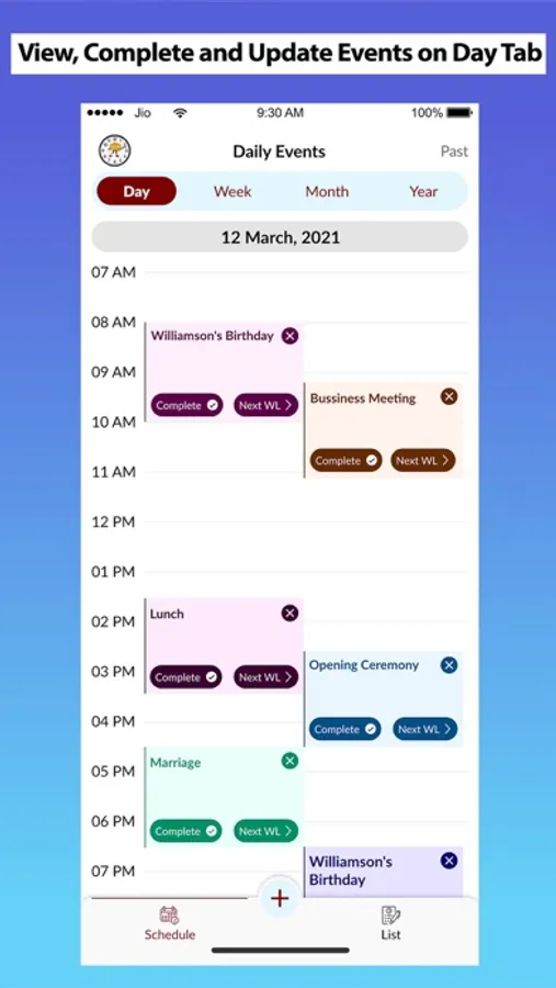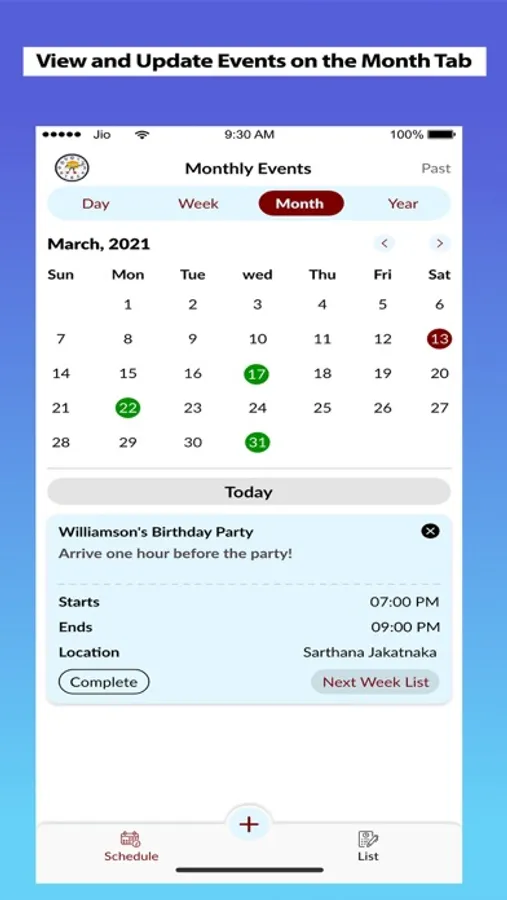 Schedule, view, complete and update event on the Day Tab, Week Tab and Month Tab