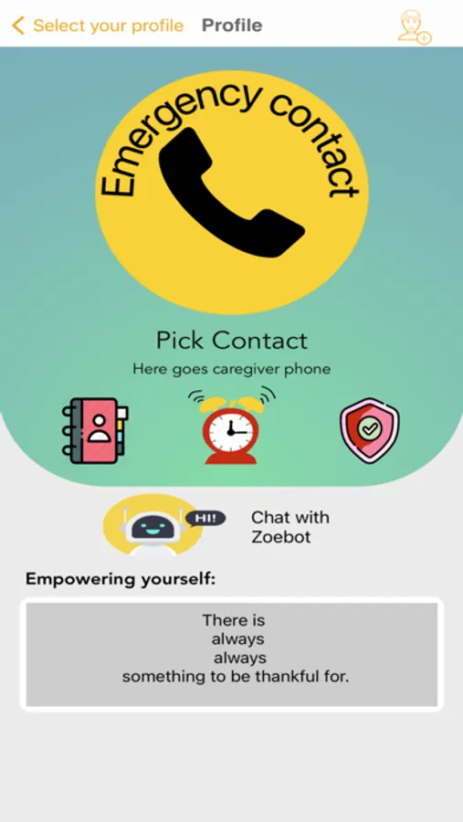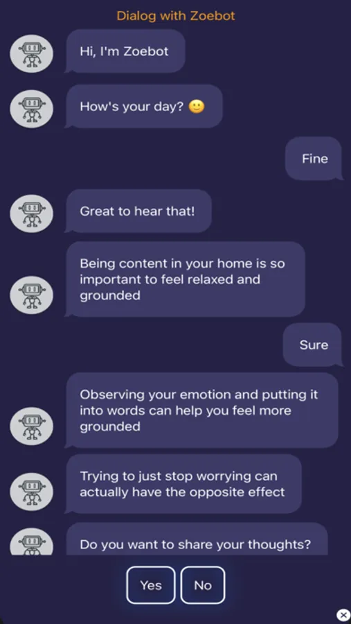 You can, in the senior profile, begin a conversation with Zoebot, our chatbot with artificial intelligence. The purpose is to detect a distorted thinking in your phrases and propose a replacements for the user ideas, in order to empower the user. Just try it! Zoebot uses natural processing language with machine learning algorithms. Your conversation is never shared, it is only local to your device.