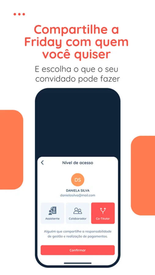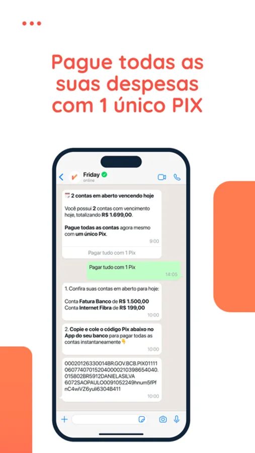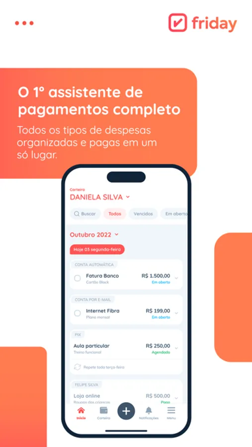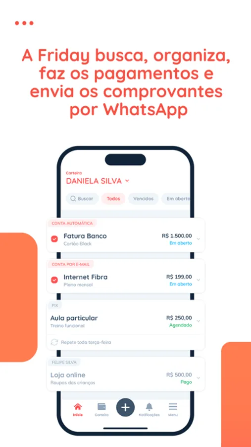 - Envie boletos para seu e-mail Friday (seucpf@friday.ai) e a conta aparecerá instantaneamente no app;