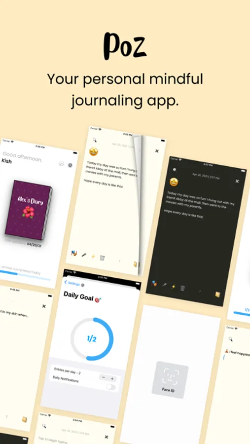 With dynamic prompts, daily goals, password protection, and your own self-recorded entries, Poz is the perfect way to check in with yourself and reflect on what matters most.
