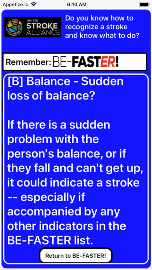 As a global, non-profit organization, United Stroke Alliance is dedicated to educating people on the Prevention, Awareness and Recovery of stroke for survivors, caregivers and their families. Our goal is to help people understand the signs of stroke and BE-FASTER! This app will be a major tool for that.