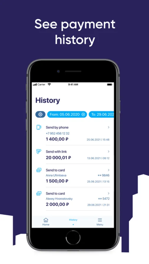 Payment History— See information about previous transactions. The history is available for all operations performed in the application and for any period from the moment of the first transaction.