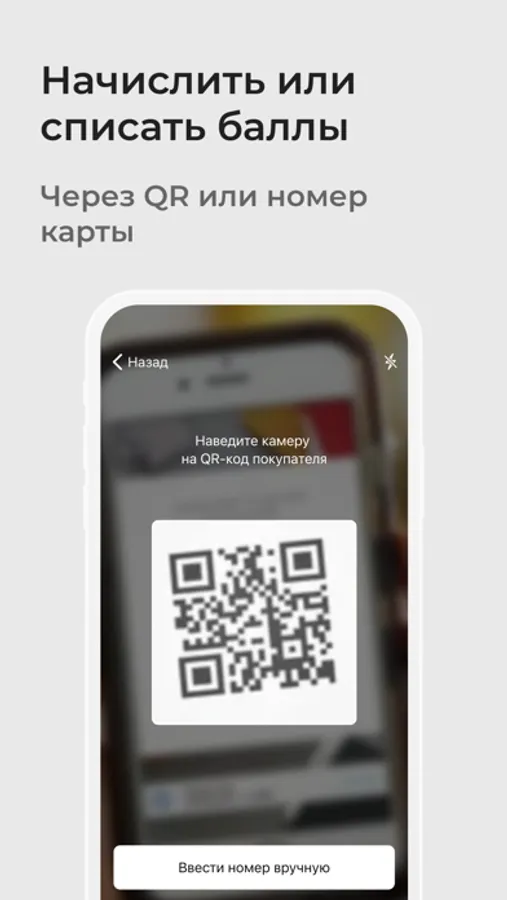 Если у вашего клиента еще нет wallet-карты вы можете легко присоединить его к программе лояльности прямо в приложении, еще и получить за это бонусные очки. Для этого достаточно открыть раздел ""Выдать карту Wallet"" в меню приложения и дать клиенту отсканировать QR-код на экране.