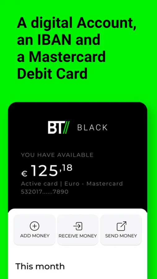 With BT// Card, controlling your expenses is much simpler. Only with your passport and a European proof of residence, you can open your digital account and receive an IBAN number and a debit Mastercard to use in thousands of places around the world.