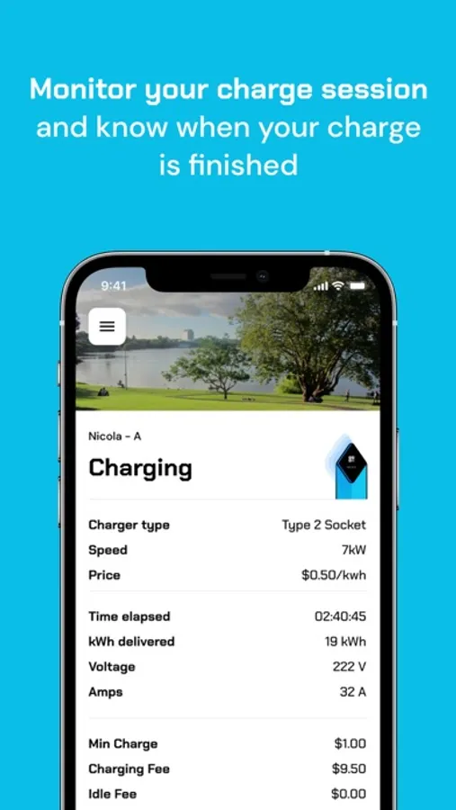 • Monitor you charging session with real time data such as time elapsed, pricing and kWh delivered and more