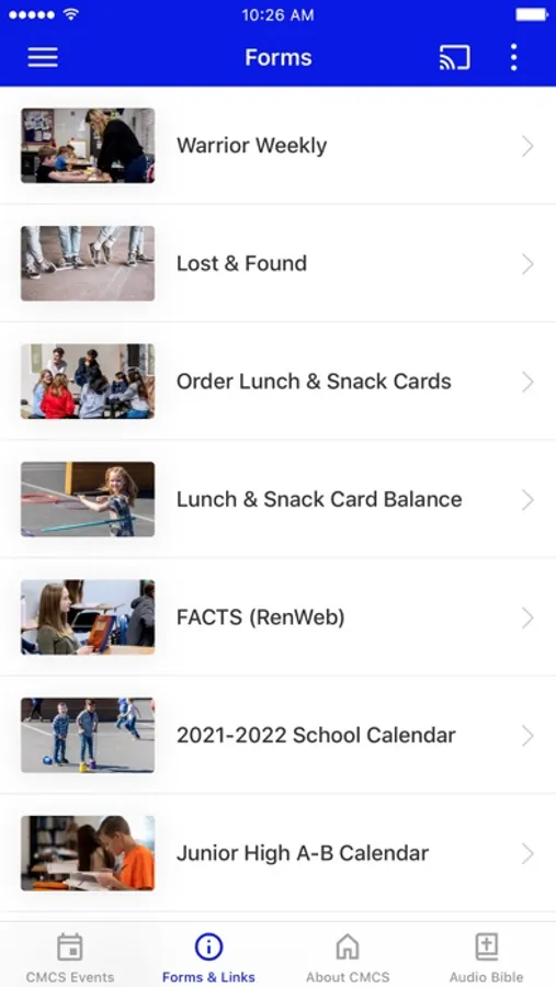 This app will help you stay connected with the day-to-day life of our school. With this app you can: stay up to date with push notifications; access important forms and links; and find out what CMCS is all about!