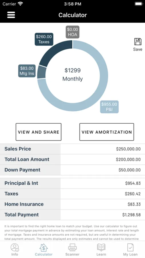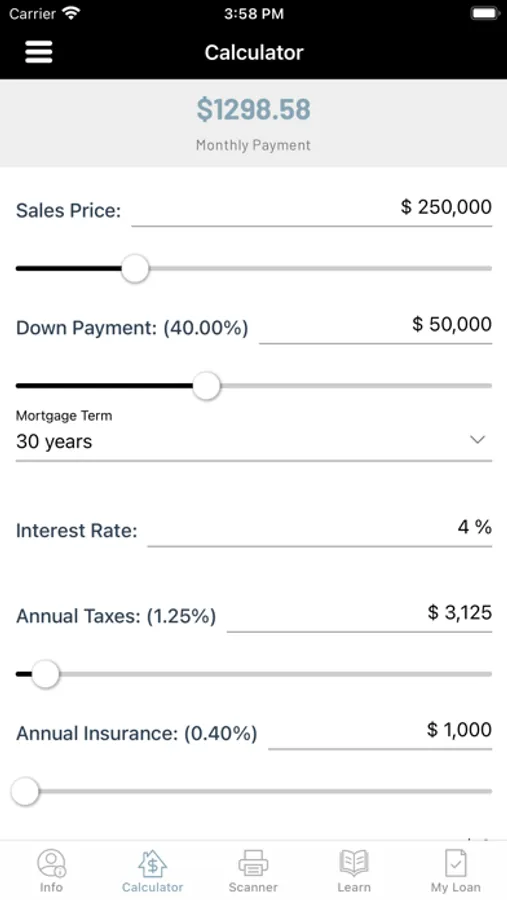 Calculate scenarios based on down payment amount, interest rate, and other variables