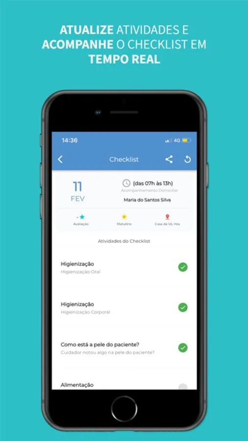 O aplicativo da CuidoSim permite que o profissional da saúde atualize as informações do atendimento possibilitando a família acompanhar as mesmas em tempo real.