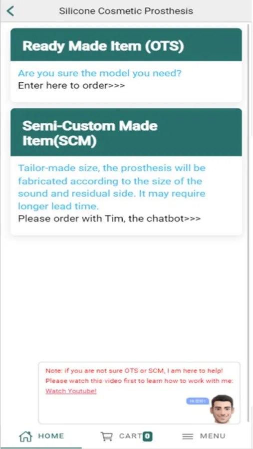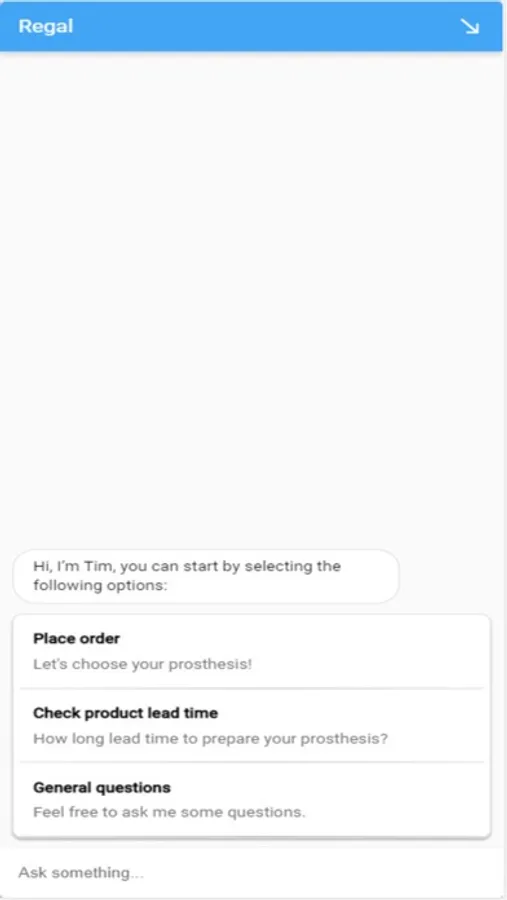 This APP serves the CPO to place orders to Regal Prosthesis ready-made and semi-custom-made silicone prostheses, lower limb components, and orthotic & rehabilitation products. The APP incorporate a Chatbot which will guide practitioners through every step to select the right silicone prostheses for the patient.