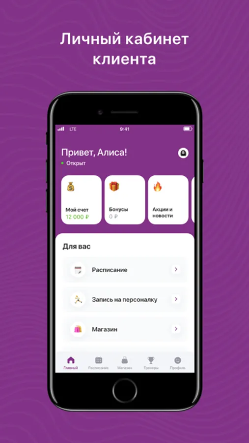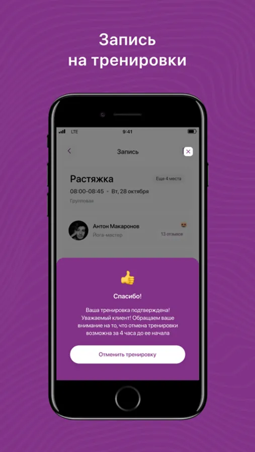 - Получать PUSH- уведомления об акциях и предстоящих тренировках.