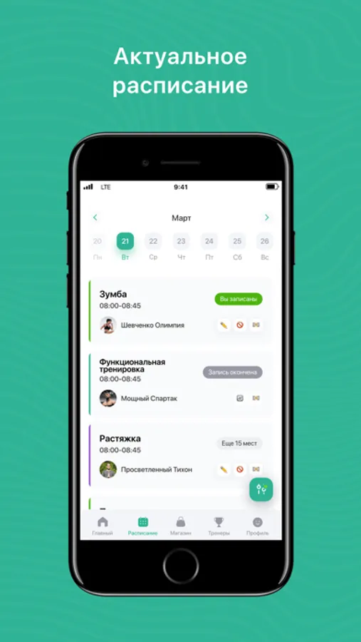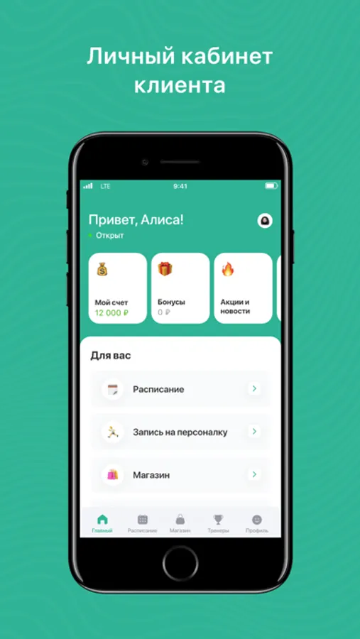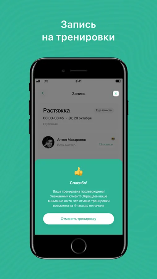 - Получать PUSH- уведомления об акциях и предстоящих тренировках.