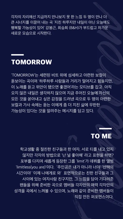 각자의 자리에선 지금까지 만나보지 못 한 느낌 두 명이 만나 더 큰 시너지를 이끌어 내는 곡 '지친 하루지만 내일이 아닌 오늘에도 행복할 가능성이 있어' 강봉근, 최승희 (B&H)가 부드럽고 차가운 새로운 모습으로 시작한다.