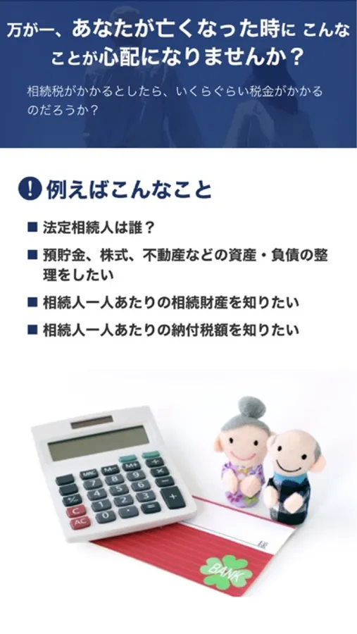 自分に万が一のことが起こった時に備え、相続税の自動計算ができるアプリです。