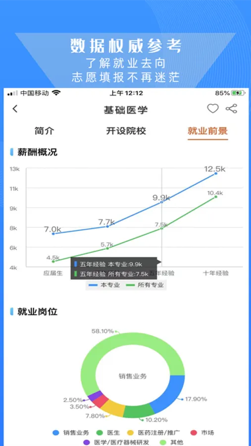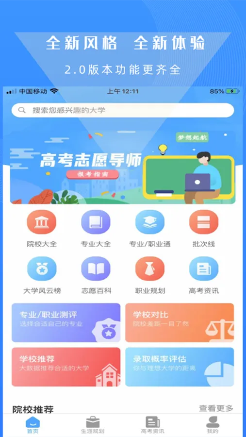 多维度复杂算法,分析最新院校招生计划、历年分数线、院校及专业热度,分析录取概率,为考生智能推荐更理想的考得上的大学。