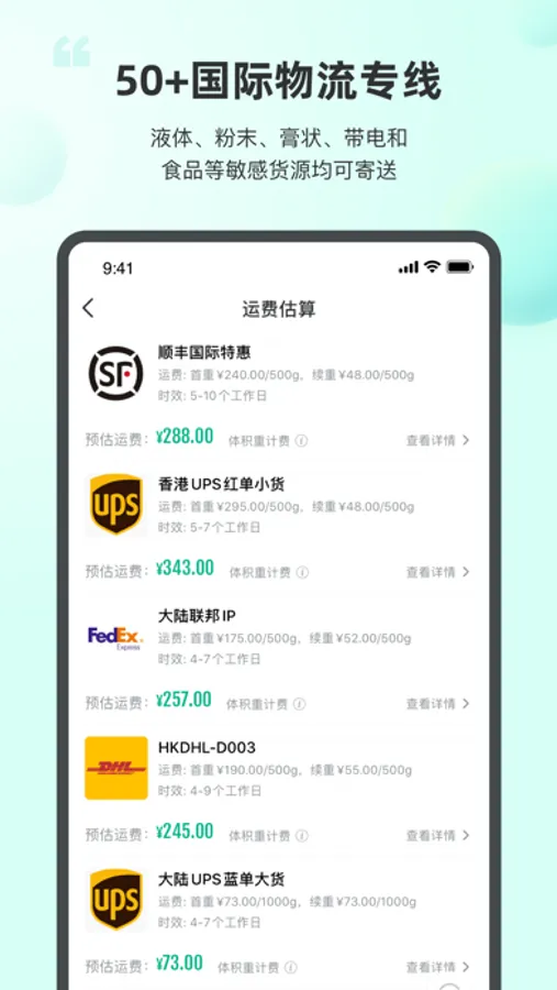 50+国际物流专线,小包,邮政,商业快递,专线等运输方式,液体、粉末、膏状、带电和食品等敏感货源均可寄送。