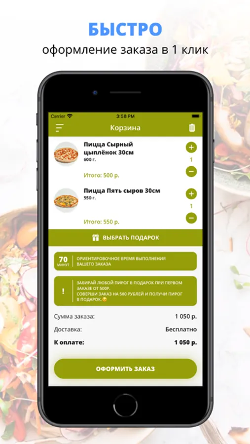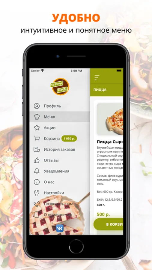 Мы используем только качественные и свежие продукты, пироги пекутся каждый день и не залеживаются. В приложении вы сможете заказать доставку еды, отслеживать статус заказа, а также Вы будете оповещены о всех новинках, акциях, конкурсах и новостях.