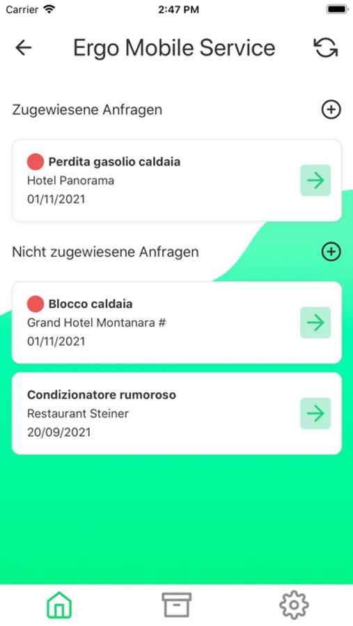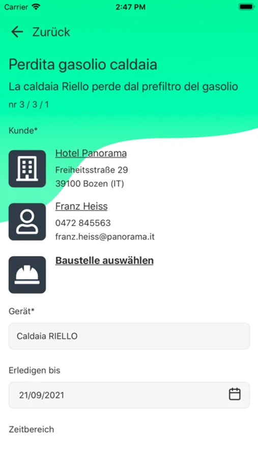 Ergo Mobile Service gibt zusätzlich auch die Möglichkeit zu jedem Zeitpunkt eine neuen Kundendienstanfrage direkt mobil über die APP aufzunehmen. In diesem Modus kann auf der APP ein neuer Kunde / Bestimmungsort direkt neu erstellt werden mit den notwendigen Daten. Es kann auch eine bestehende Baustelle / Kunde / Bestimmungsort ausgewählt werden unter der Angabe zusätzlichen Daten wie die Beschreibung der durchzuführenden Arbeiten, die Kontaktperson, Termin für Erledigung, Zeitraum, Priorität.