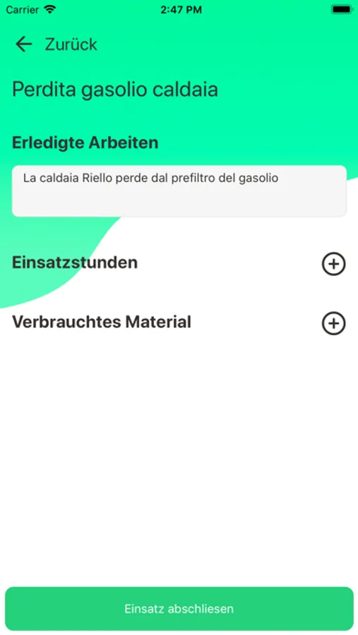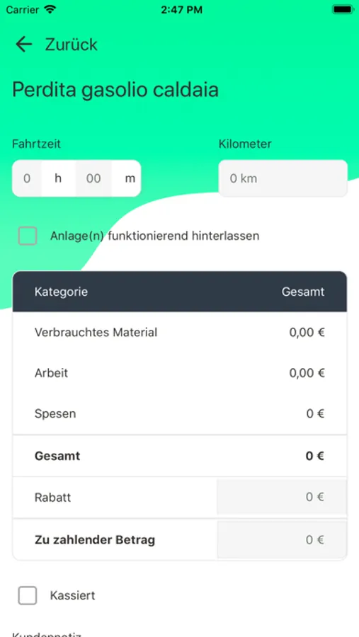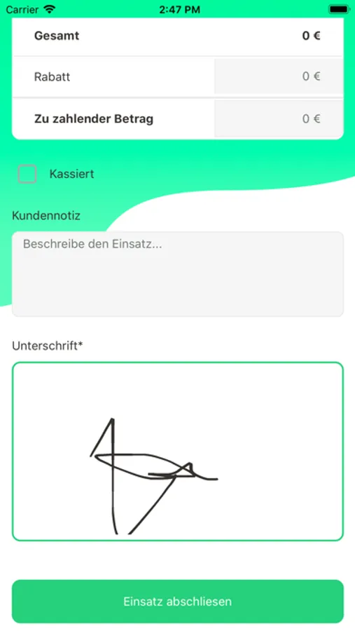 Der Abschluss des Einsatzberichtes berechnet den zu bezahlenden Gesamtbetrag, und dieser kann auch als Bezahlt oder als Teilzahlung gekennzeichnet werden.