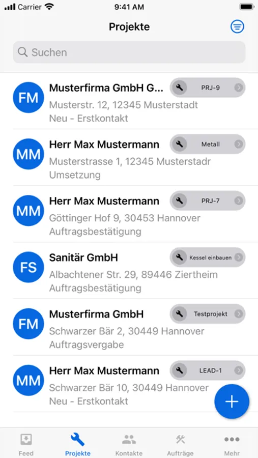Begleiten Sie Ihre Projekte vom Status Neu-Erstkontakt über die Umsetzung, bei der Sie Rapporte mobil erstellen, digital unterschreiben lassen und diverse Fotos aufnehmen bis hin zum Abschluss.