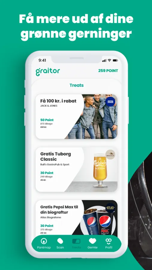 Graitor is a new digital solution that gives you points every time you deposit bottles and cans with and without a value. You redeem the points for free treats offered throughout the country.