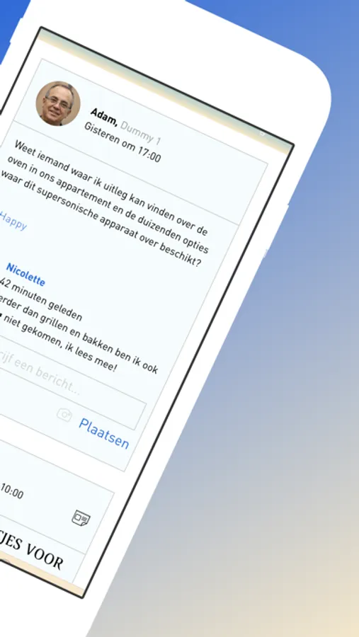 In the app you can share messages with other residents on the timeline and contact the servicemanager directly. You can also read in the app the latest news about the building and the environment, you can use different convenience services and you will find up-to-date manuals about your home.