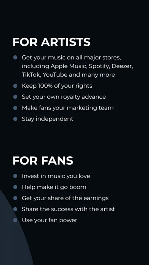 • Set your own royalty advance• Make fans your marketing team• Stay independent