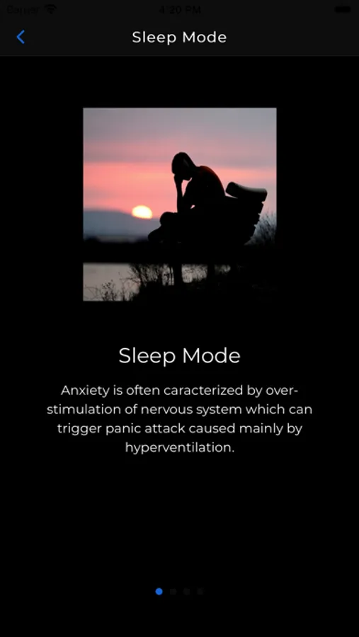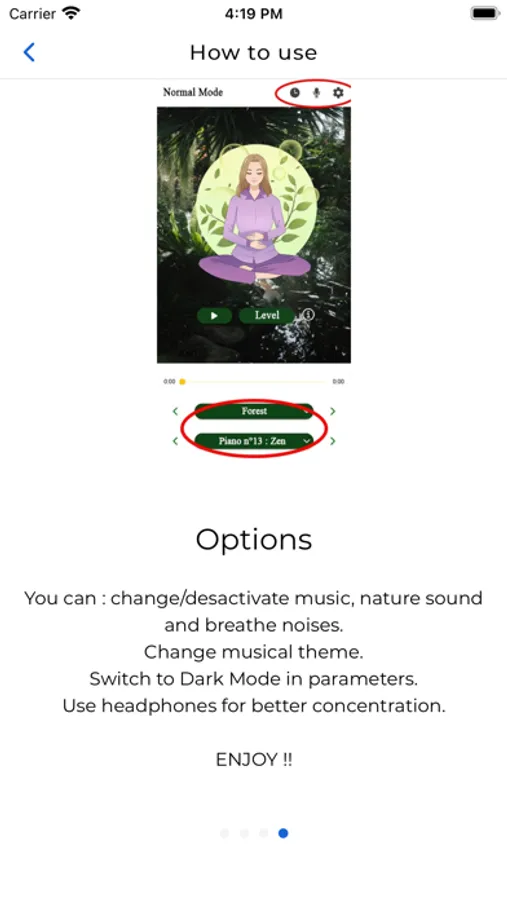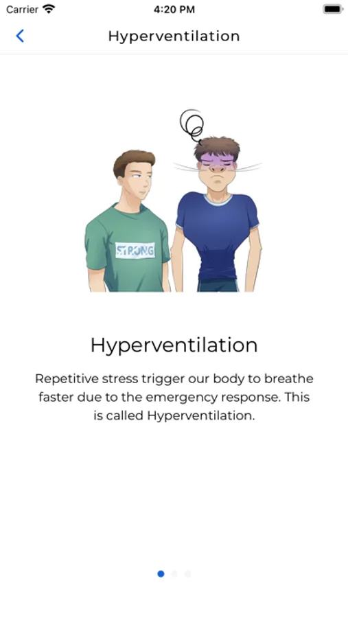 The application provides large scale of level depending on your initial situation. If you are high hyperventilating and really anxious begin with low level (12 breaths per minute) and train with that until you feel confident. Then switch to the next level (11 breaths per minute) and continue this process until you reach slow breathing levels (6/7/8 breaths per minute). If your initial level is higher feel free to adapt yourself and train until you can slow your breath again.