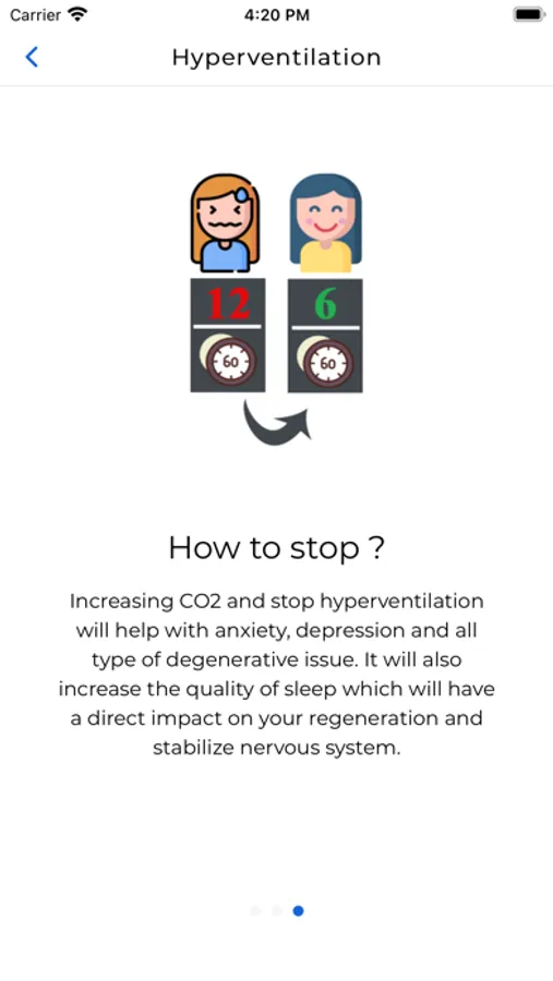 Our application is developped in order to reproduce exercices that will help your body come back to slow breathing, thus increasing CO2 and its protectives effects. Increasing CO2 and stop hyperventilation will help with anxiety, depression and all type of degenerative issue. It will also increase the quality of sleep which will have a direct impact on your regeneration and stabilize nervous system.