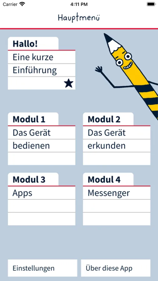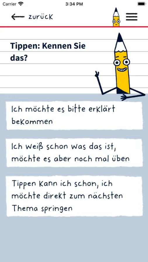 Für den ersten Einstieg empfiehlt es sich, die Themen der Module nacheinander zu erkunden. Je nach eigenem Interesse und Bedarf können Sie die Themen und Übungen über das Menü auch einzeln ansteuern und die App flexibel nutzen.