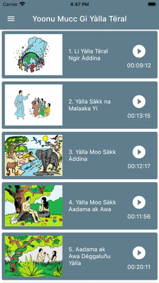 Listen to Bible stories in Wolof and follow along with text in Wolof, English, French or Portuguese.