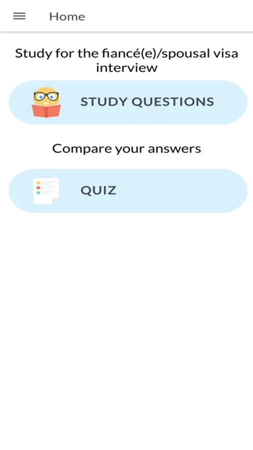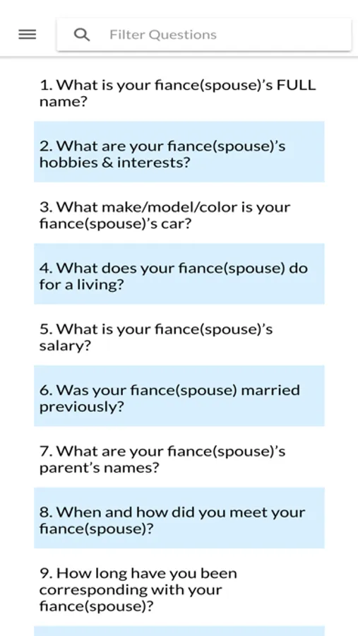 This app has more than 100 possible interview questions. You can read it, try to match your answers with your fiancé(e) or spouse and prepare for the final step of your visa process.