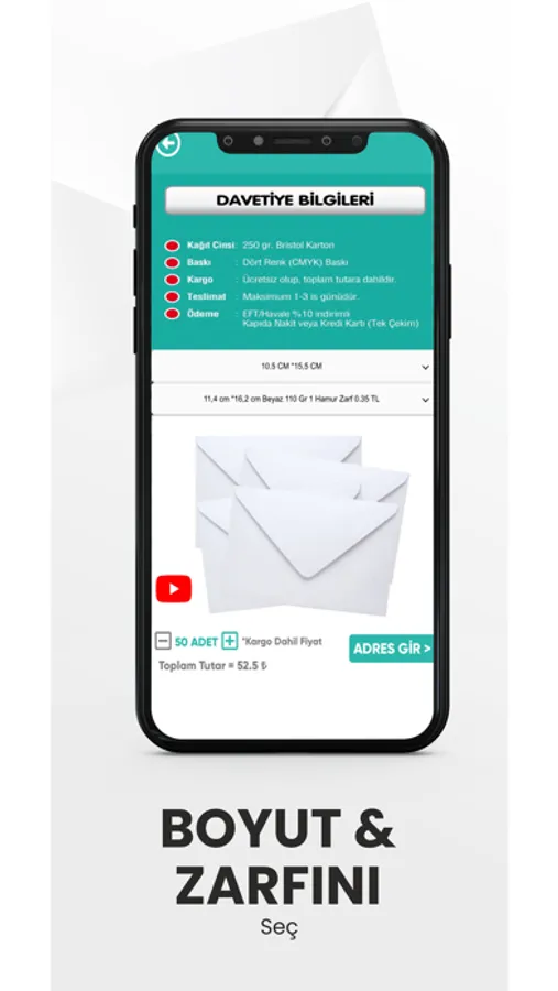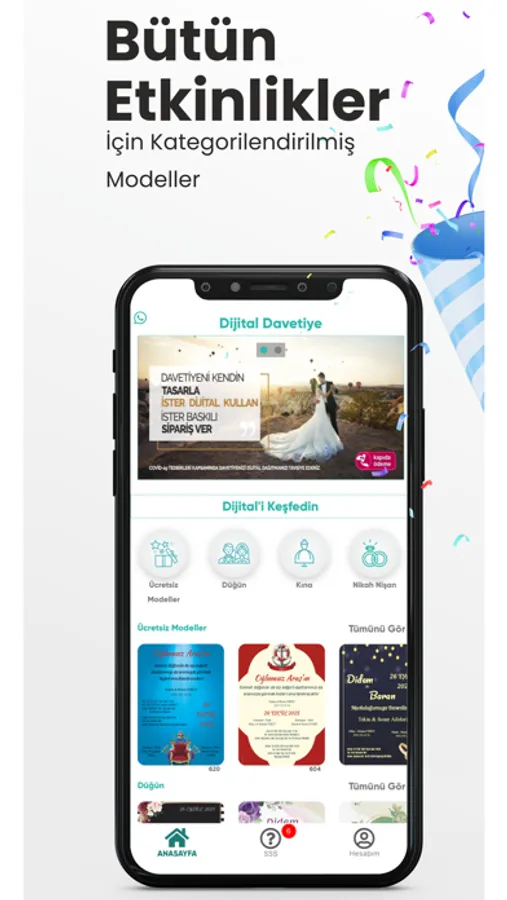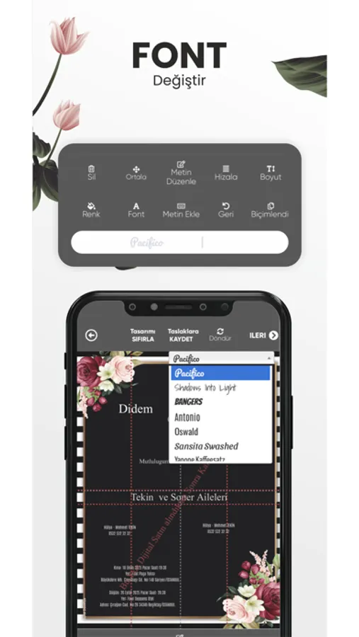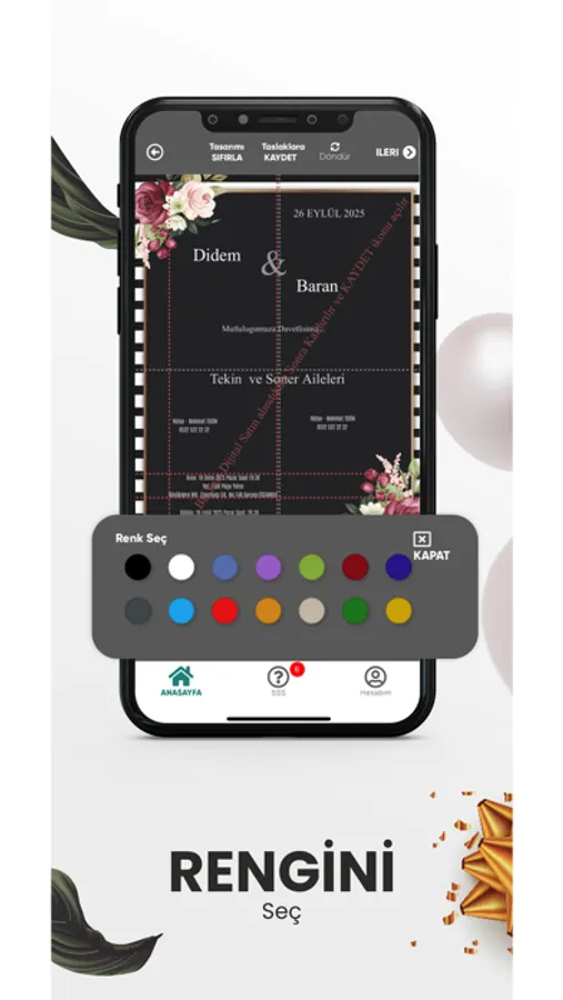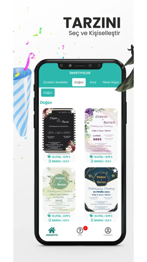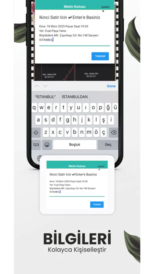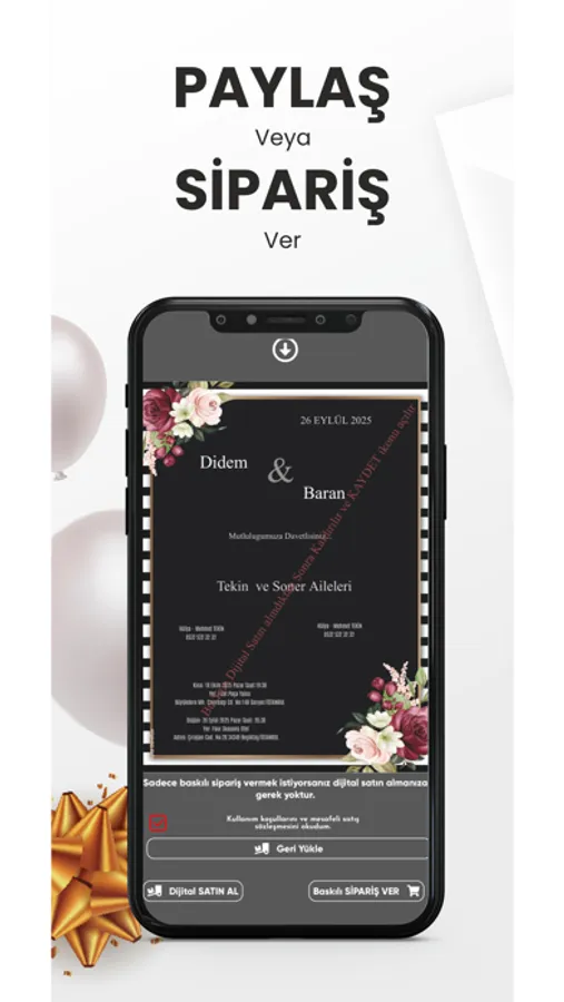 İsterseniz dijital davetiyenizi telefon galerinize kaydedin veya baskılı siparişe göndererek baskılı davetiyelere sahip olun.