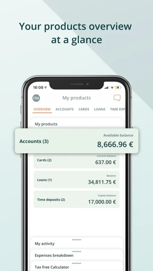 Pull down at the bottom of the screen with your finger to refresh the data of the page you are on. Choose between light, dark or auto theme. Log out of the app by using the “Shake to log out” function. Apply your own transfer/payments limits, so that the danger of mistakenly transferred capital from your account to third parties is reduced. Find out, about your expenses per year and by type with the built-in "Spending Analysis" tool. Calculate your deductible tax using the built-in tool. With one password you can track and manage multiple accounts (corporate and individual), by activating the "single sign-on" service, by visiting one of our branches.