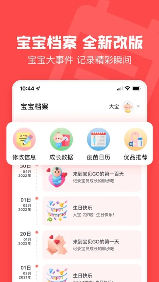 「自定义宝贝档案」记录宝贝和妈妈的每一个重大瞬间和美好记忆,时间不留遗憾的同时 - 更能为您的家量身打造个性推荐安利。BabyGo相信,每一个宝贝都是特别的,宠爱宝贝,我们是认真的。