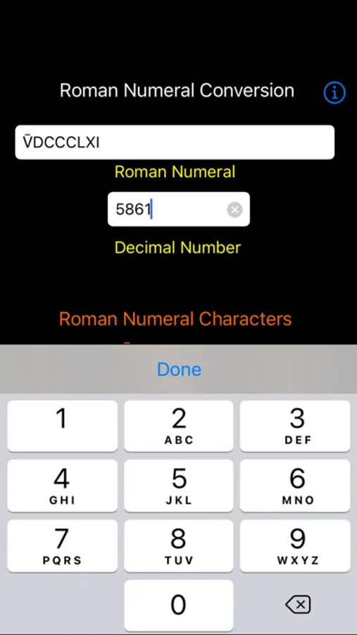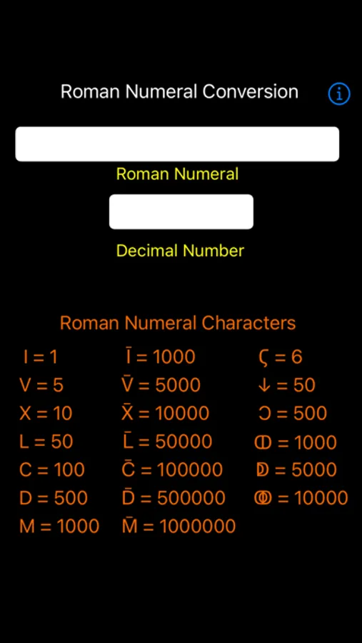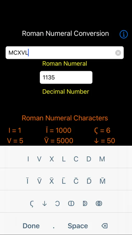 This app provides a fast and simple method of converting Roman Numerals into ordinary Arabic numbers and vice versa. It includes a customized Roman Numeral keyboard with the 7 common Roman Numeral characters (M, D, C, L, X, V, and I) as well as 13 additional less-common characters that allow this app to handle larger numbers than most Roman Numeral Converters.