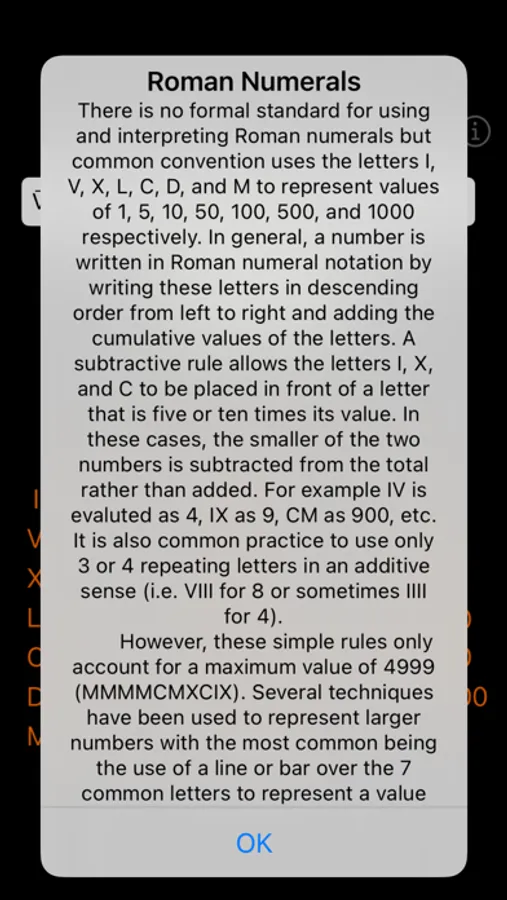 Although there are common conventions for writing numbers in Roman Numeral Convention, there is no formal standard for doing so. For example, the number 988 is commonly represented as CMLXXXVIII; however, IIXM is equally valid. This app utilizes an conversion algorithm that properly converts any Roman Numeral string containing any combination of the 20 characters supported by the app.