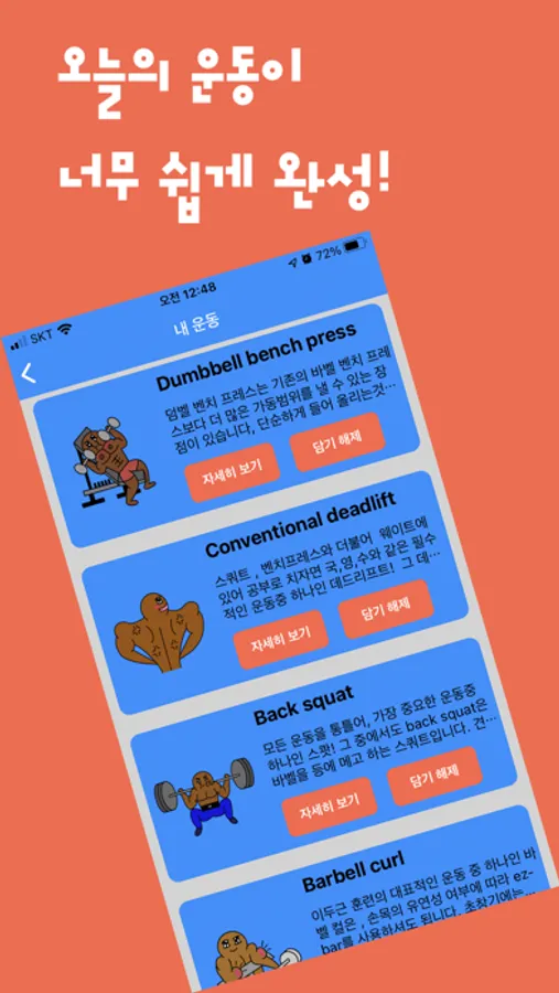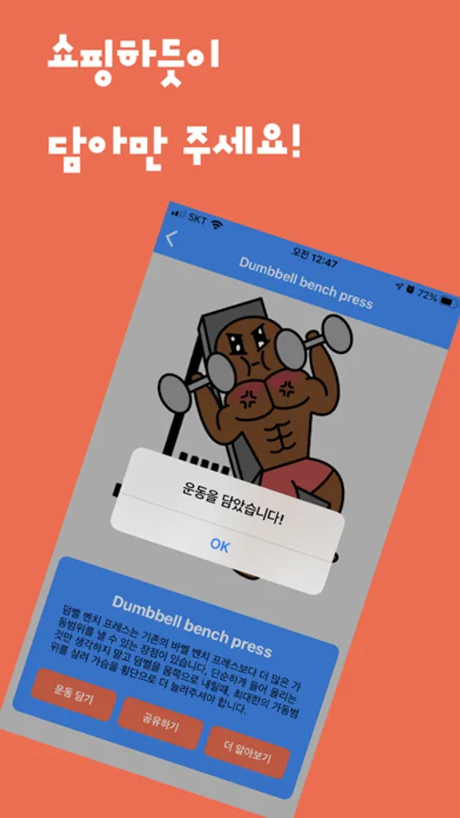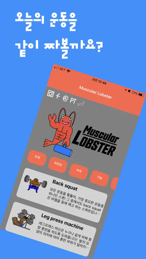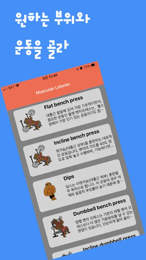 Muscular Lobster는 운동 초보자들이 보다 더 쉽게 운동 프로그램을 짤 수 있도록 도와줍니다! 각 부위별 다양한 운동들은 물론 , 워밍업 및 유산소 운동까지 활용하여 운동 프로그램을 구성 할 수 있습니다!